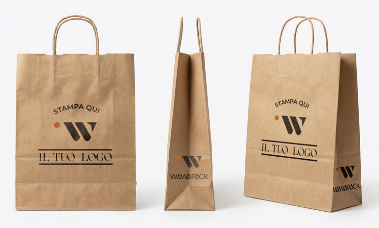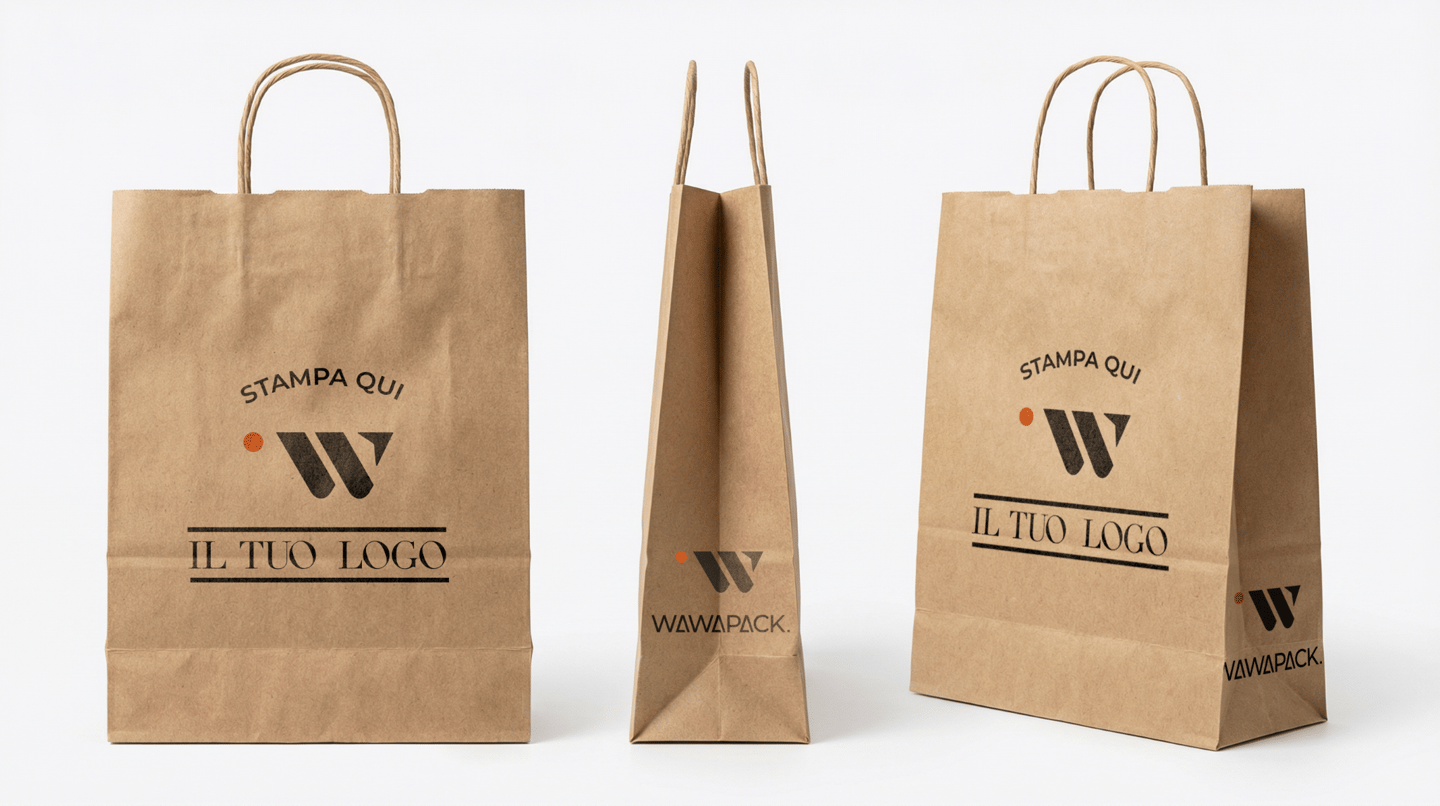 Shopper con stampa logo o full print, realizzati su carta kraft o bianca, ideali per comunicare l’identità del tuo brand in modo elegante e coerente. Soluzioni professionali pensate per il settore retail e horeca,in grado di valorizzare l’immagine del marchio attraverso una personalizzazione accurata, disponibili anche per piccole tirature.